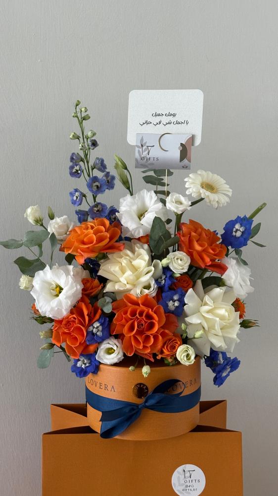 بوكس فاخر من لوفيرا شوكلت مع تنسيق أنيق من الورود الطبيعية بالألوان الزاهية (برتقالي، أزرق، أبيض)، يجمع بين فخامة الشوكولاتة السويسرية المميزة ورقي تنسيق الزهور. مناسب كهديّة فاخرة في جميع المناسبات مثل التهاني، الأعياد، أعياد الميلاد، وحفلات التخرج.
