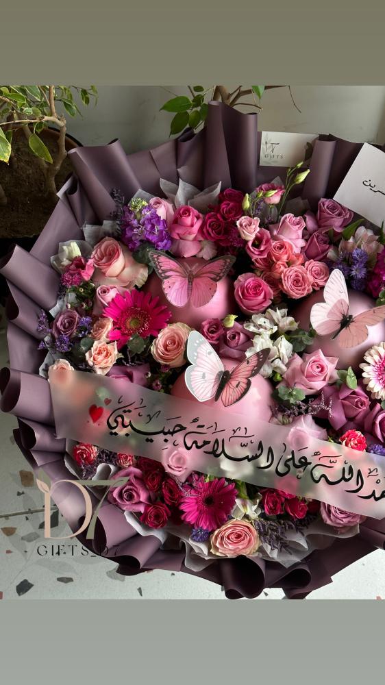 بوكيه ورد طبيعي فاخر بتنسيق كبير يجمع بين الورود الوردية والبنفسجية بدرجات أنيقة، مع تغليف فخم وفراشات تضيف لمسة من الجمال والبهجة. البوكيه مزوّد بعبارة قابلة للتخصيص مثل “الحمد لله على السلامة” أو أي رسالة إهداء تختارها، مما يجعله الهدية المثالية للمناسبات الخاصة: تهنئة، عيادة مريض، استقبال مولود أو تعبير عن المحبة والامتنان.