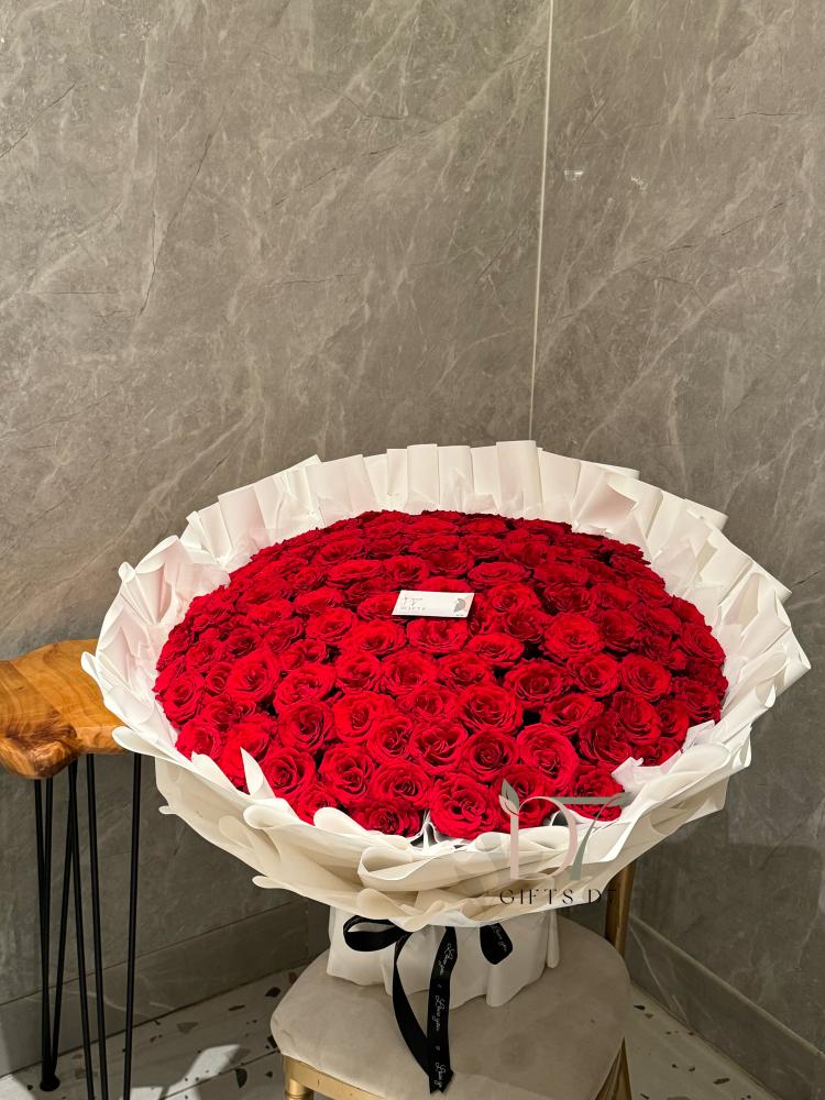بوكيه ضخم بـ 100 وردة حمراء طبيعية، متناسقة بدقة داخل تغليف فاخر باللون الأبيض، يوصل أعمق مشاعر الحب والفخامة في لحظة واحدة.