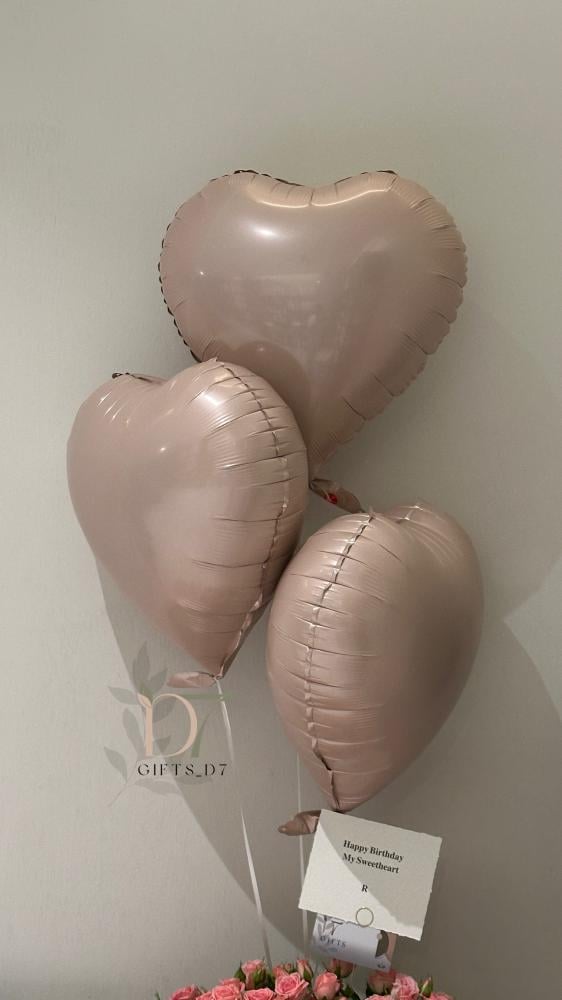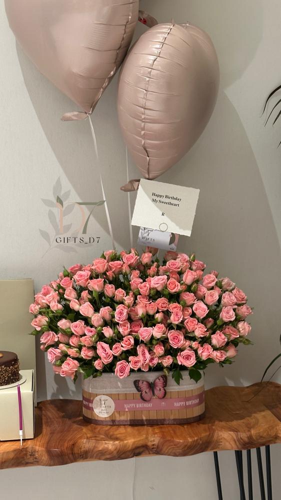 تضم تنسيقًا مميزًا من ورد طبيعي وردي بعدد كبير داخل علبة فاخرة مزينة بشريطة Happy Birthday وفراشة أنيقة، مع ثلاث بلونات هيليوم على شكل قلوب بلون بيج لامع تضيف لمسة من الحب والرقي.