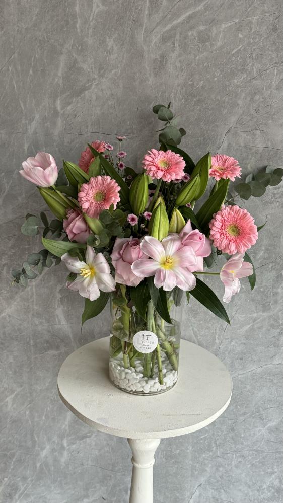 فازة زجاجية أنيقة مليانة ورود طبيعية بألوان وردية هادية ولمسة بيضاء، تحتوي على توليفة من الليليوم، الجيربيرا، وزهور موسمية تنسّق يدويًا بدقة.