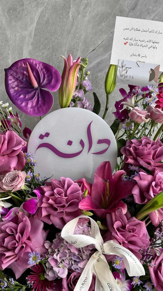 فازه زجاجية دائرية بتنسيق ورد فاخر بدرجات البنفسجي والوردي، مزينة بقاعدة أكريلك أنيقة مع إمكانية كتابة الاسم لتكون هديتك أكثر تميزًا وشخصية. تصميم فخم يناسب المواليد ، مناسبات التهنئة، التخرج، الزواج، وأعياد الميلاد. مثالية كهدايا فاخرة تعبر عن الذوق والاهتمام بالتفاصيل
